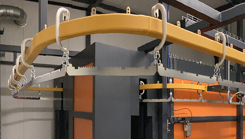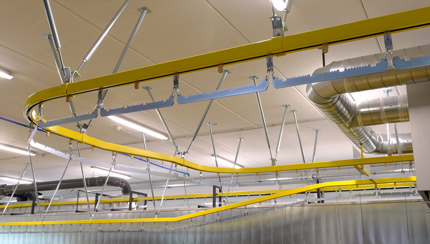Výrobky nebo jejich části jsou zavěšeny na řetězu a jedna nebo více pohonných jednotek je posunují po celé lince. Flexibilní navěšování výrobků na dopravník umožňují hřebenové profily, které se zavěšují na unašeče řetězu, a případně také C-háky.
