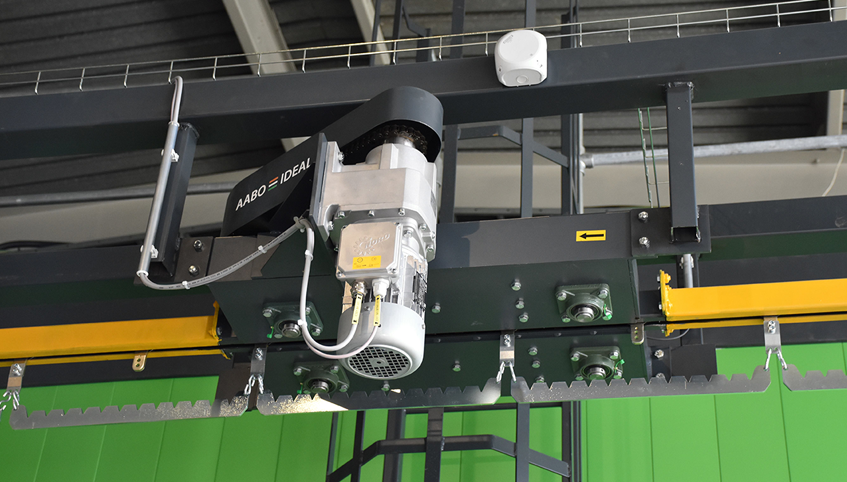 Rychlost řetězu může být plynule regulována pomocí frekvenčního měniče. Pneumatické napínací zařízení udržuje řetěz v napnutém stavu.