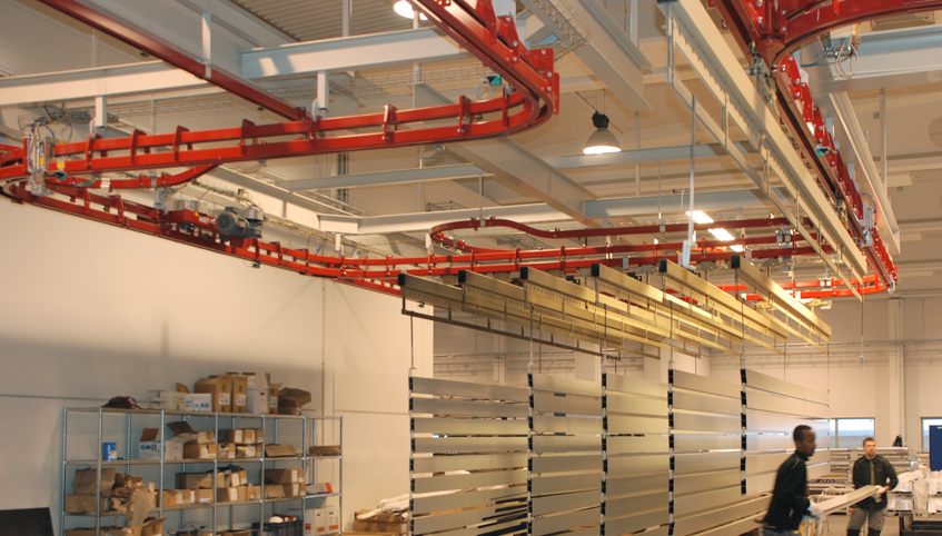 Each wagon carries one or more products or product parts. The wagon runs in an open “free” profile, and on top of this is the chain profile, the “power” – hence the name “Power and Free”